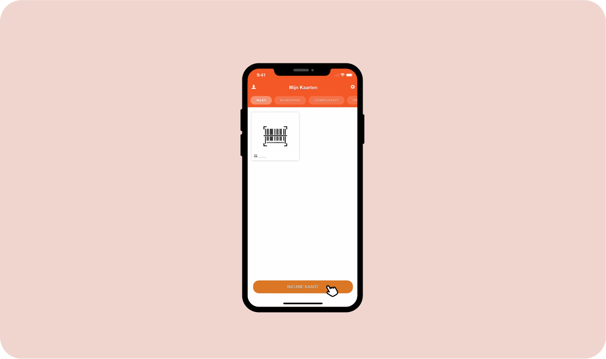 Om een nieuwe fysieke klantenkaart te bewaren open je de Wallet app en klik je onder op de "Nieuwe kaart" knop.